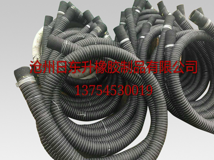 該類(lèi)膠管采用高強(qiáng)度,高耐磨合成橡膠做成,中間用布或簾子線增強(qiáng),并用螺旋鋼絲做骨架,膠管通經(jīng)DN102,兩頭有25cm,左右的擴(kuò)口,擴(kuò)口大小,由客戶決定,一般為104,106,108,110.(便于往罐車(chē)上安裝),根據(jù)客戶要求,膠管外還可以做外鎧(,就是外上螺旋鋼絲,保護(hù)外皮不被磨損)。長(zhǎng)度一般為6米,7米,8米,10米,7米的居多。